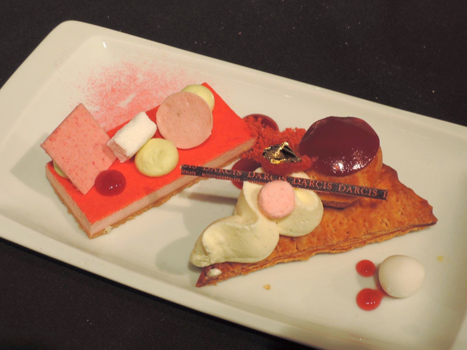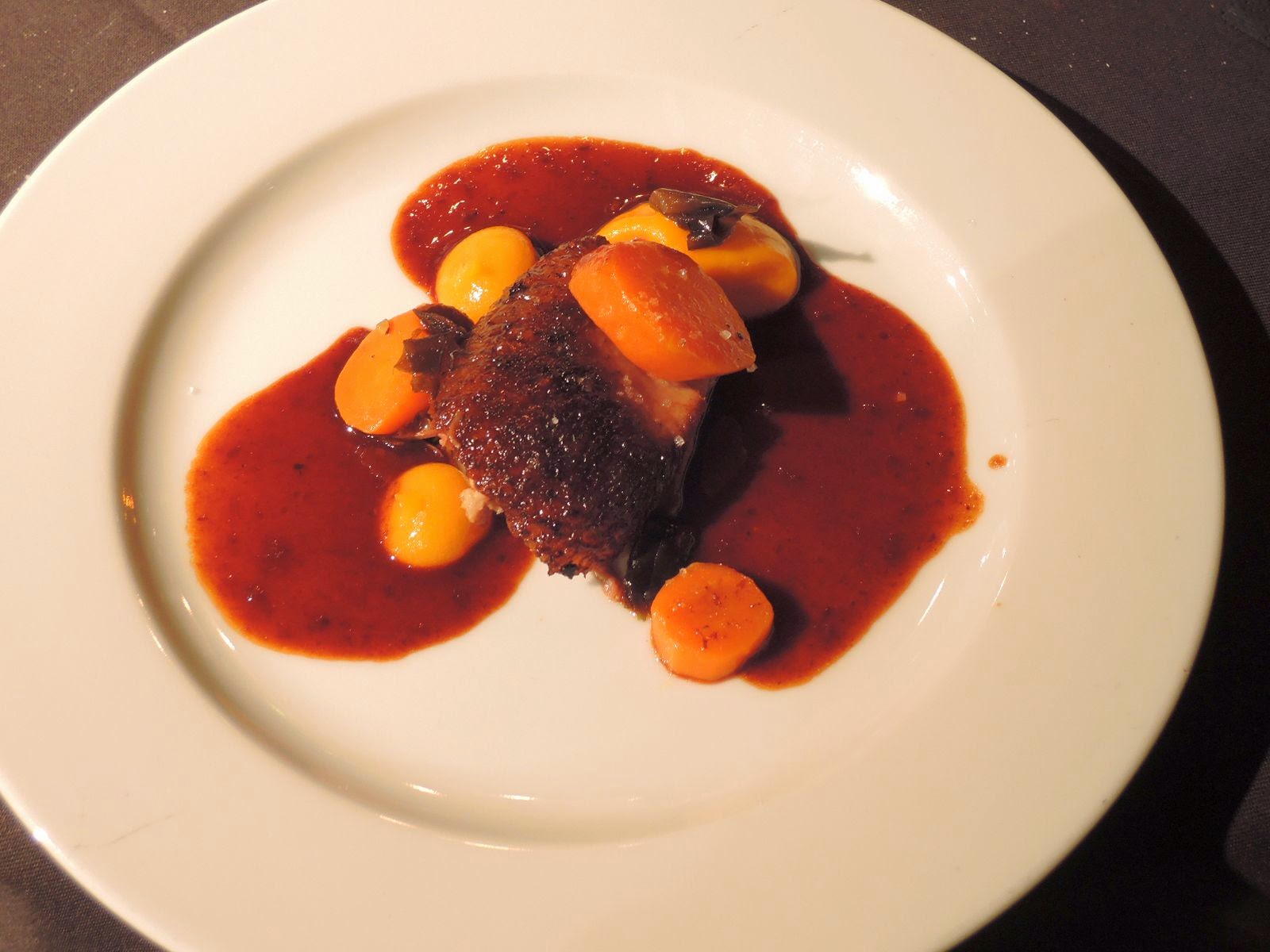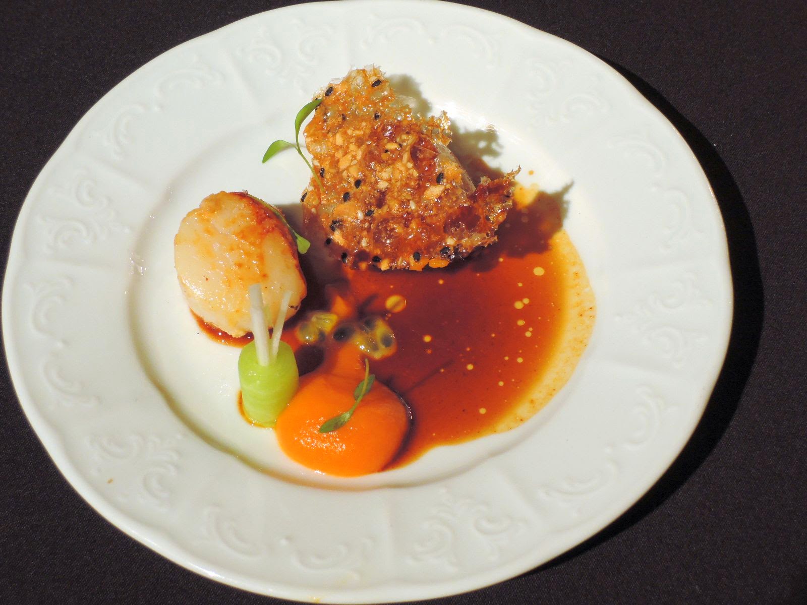 Sint-Jacobsvrucht, ganzenlever, wortelmousseline, peper, gember, plumsaus, pindanoot, krokant gebakje met sésamzaad