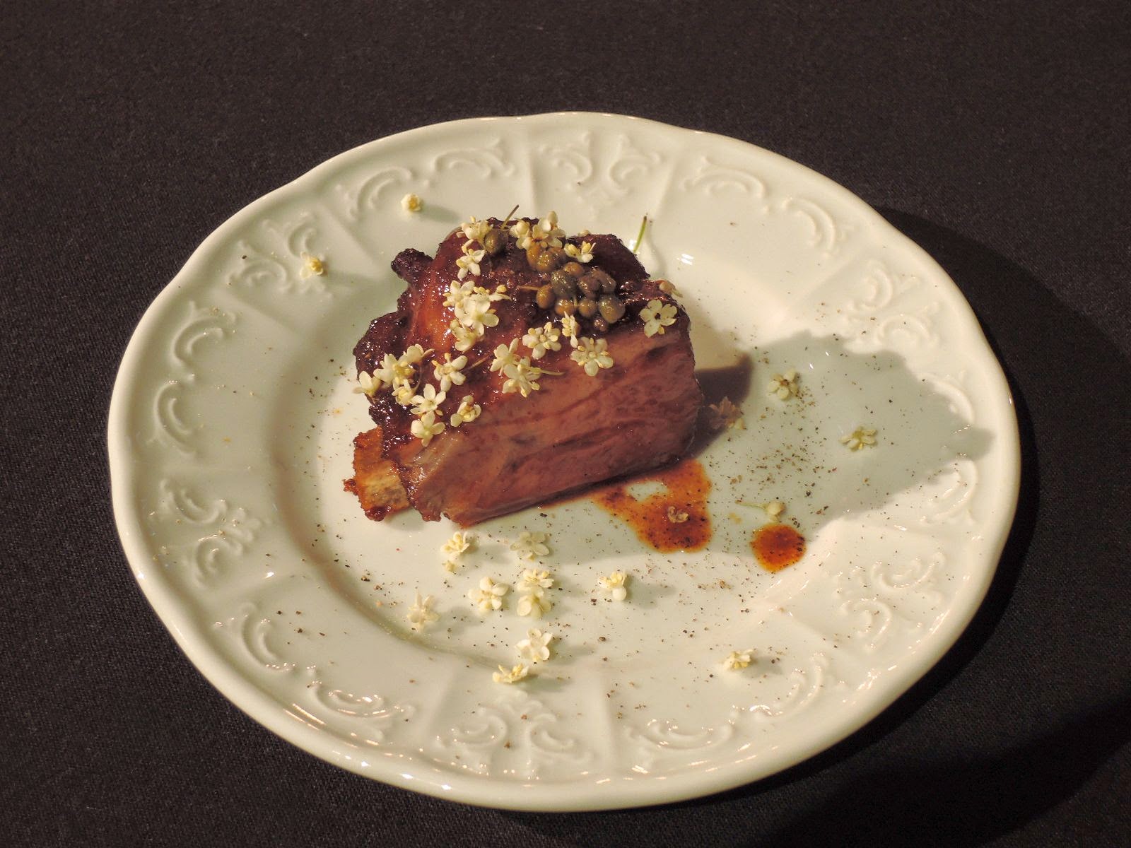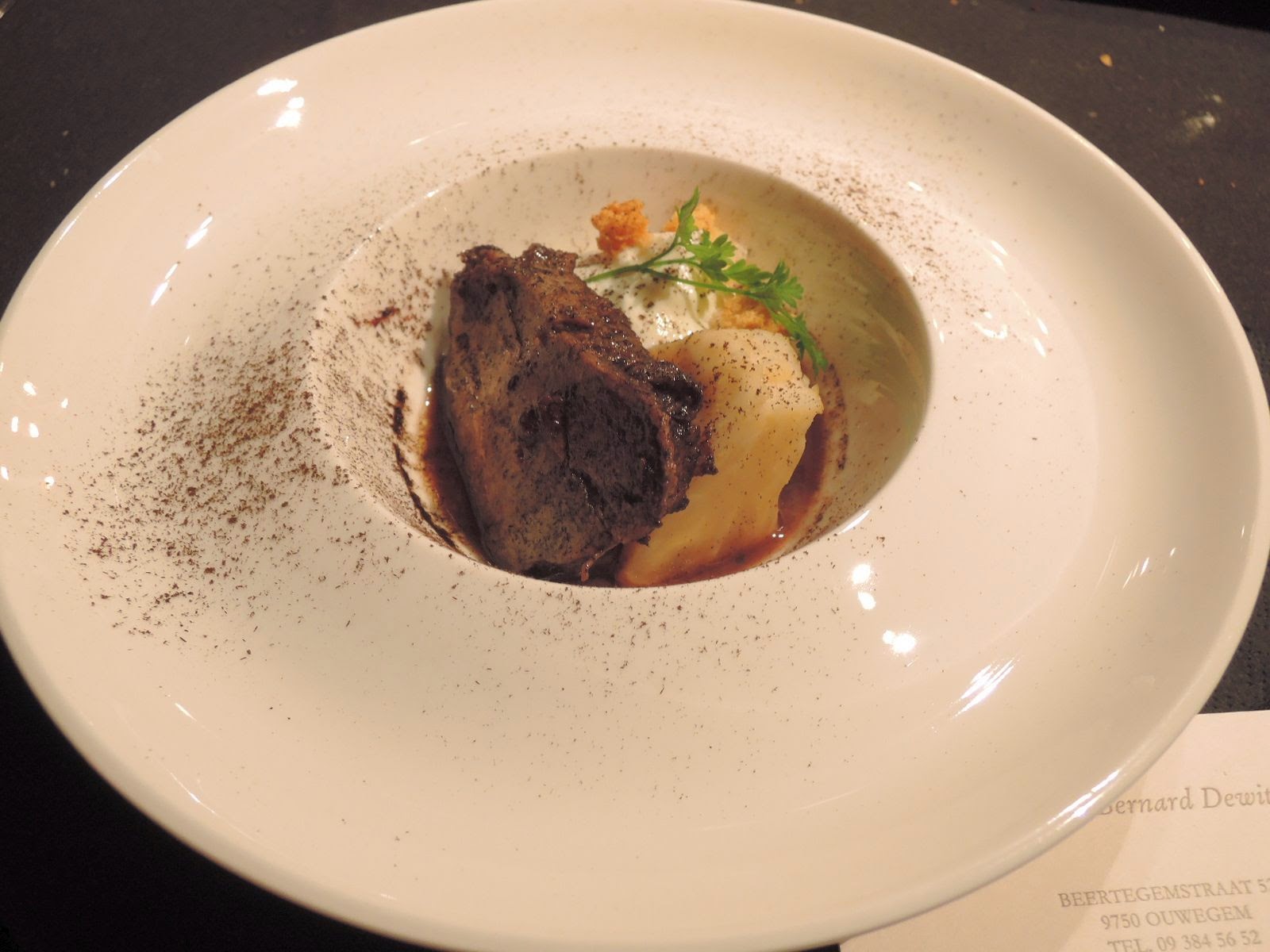 Kalfswang met op stro gerookte knolselder, bonenkruid en olijf
