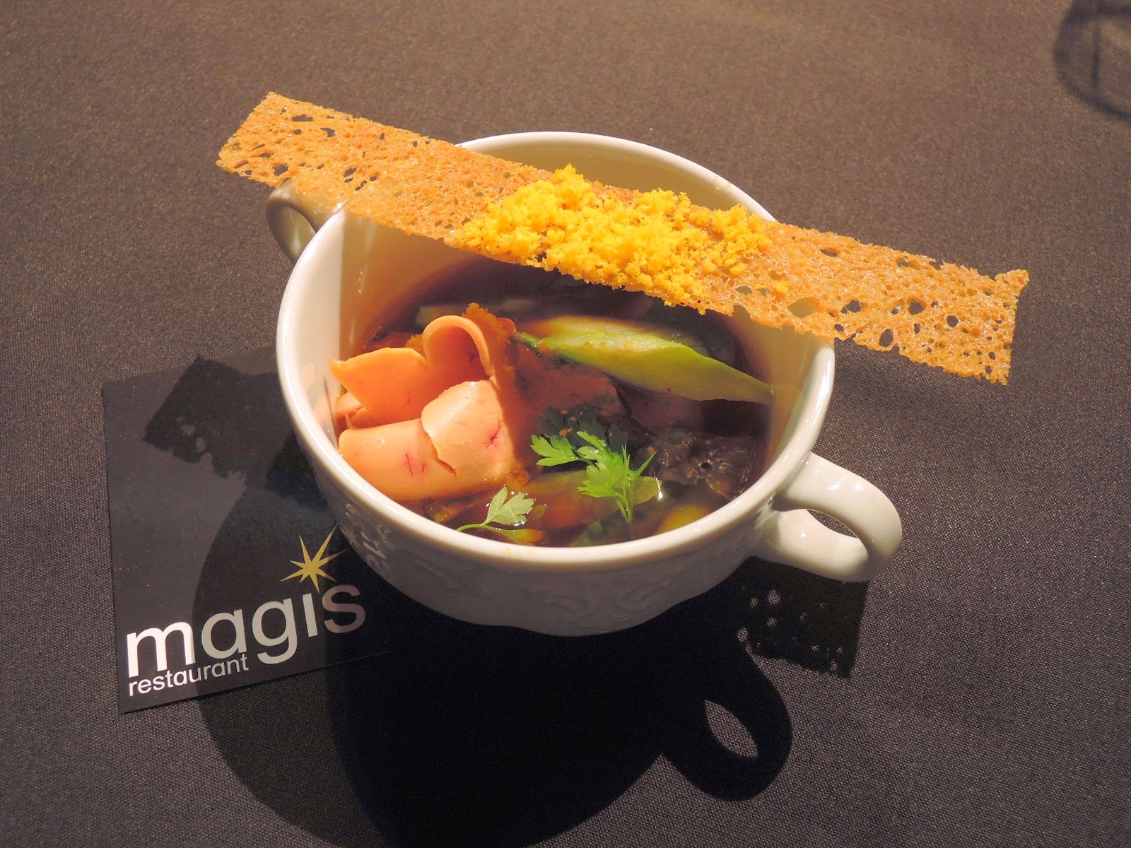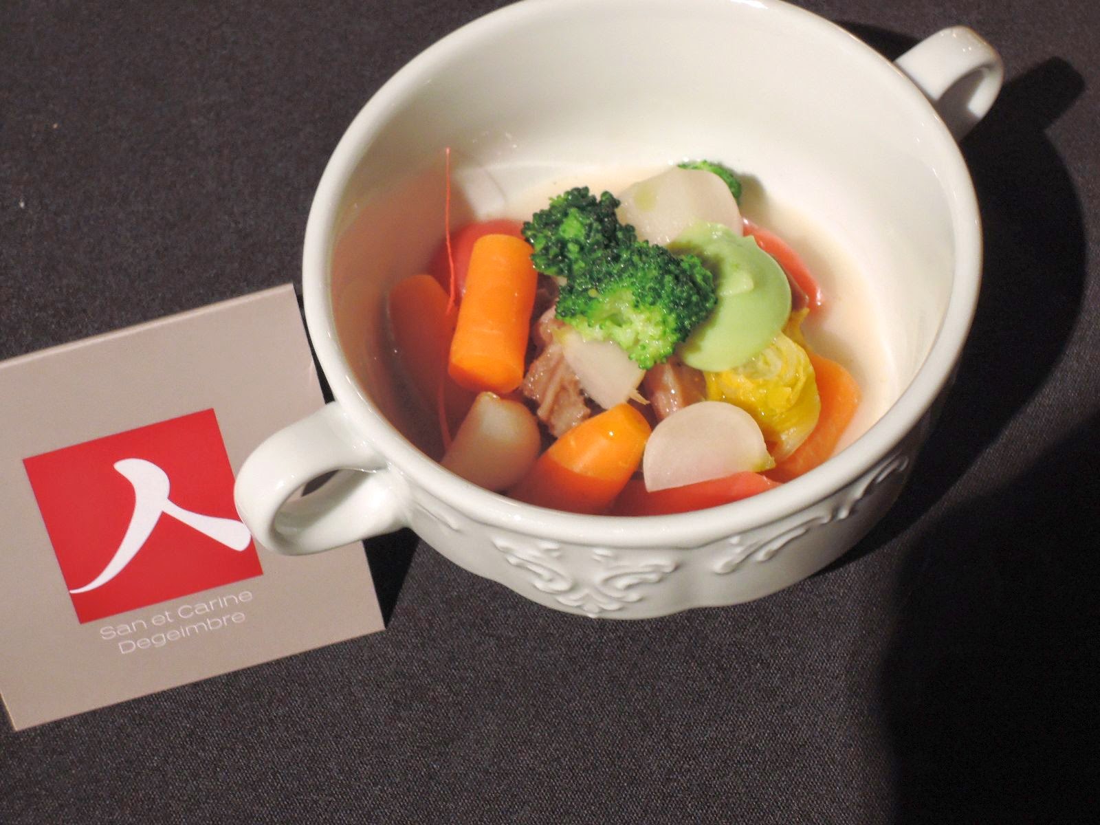 Groentenbouillon met oesters, huisbereide Pastrami, krokant gebak met boekweit