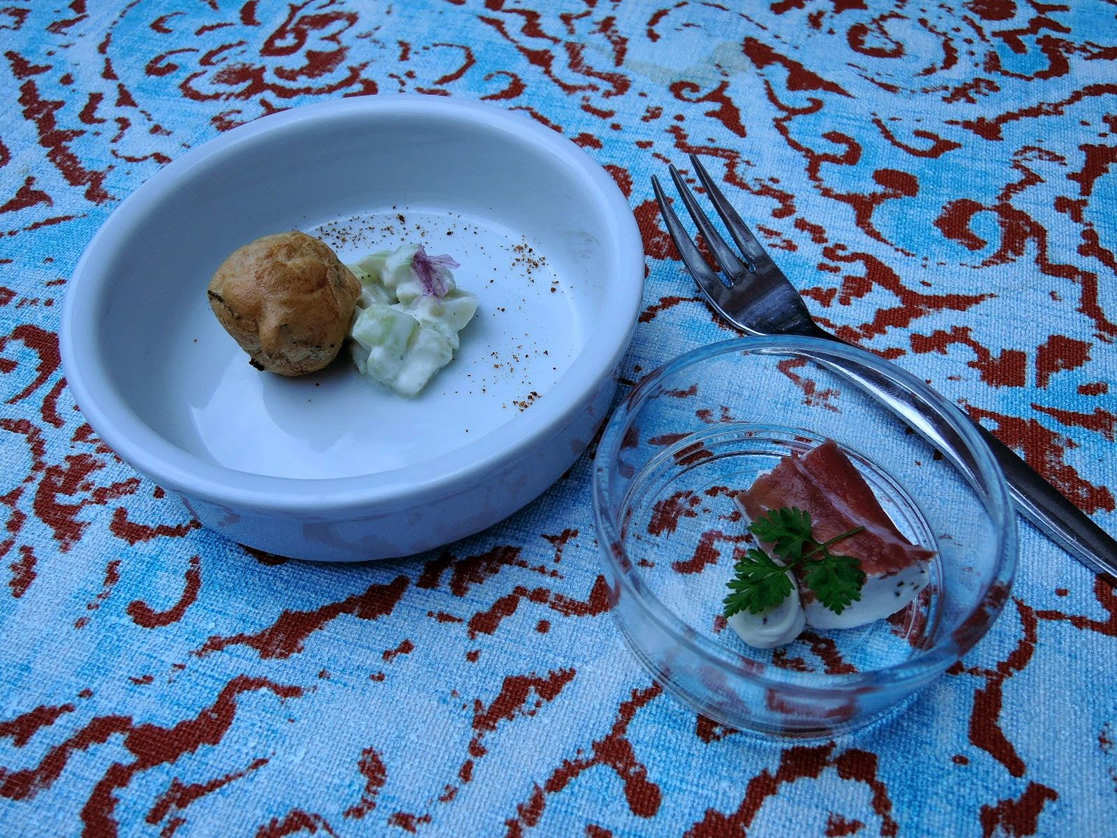 Bij dit aperitief werden twee smakelijke hapjes geserveerd, enkel spijtig dat het soesje met kruidenkaas op kamertemperatuur was en niet lekker fris terwijl het buiten 29 graden was.