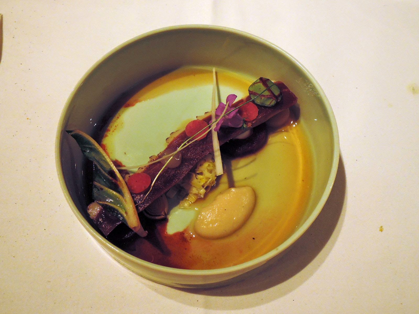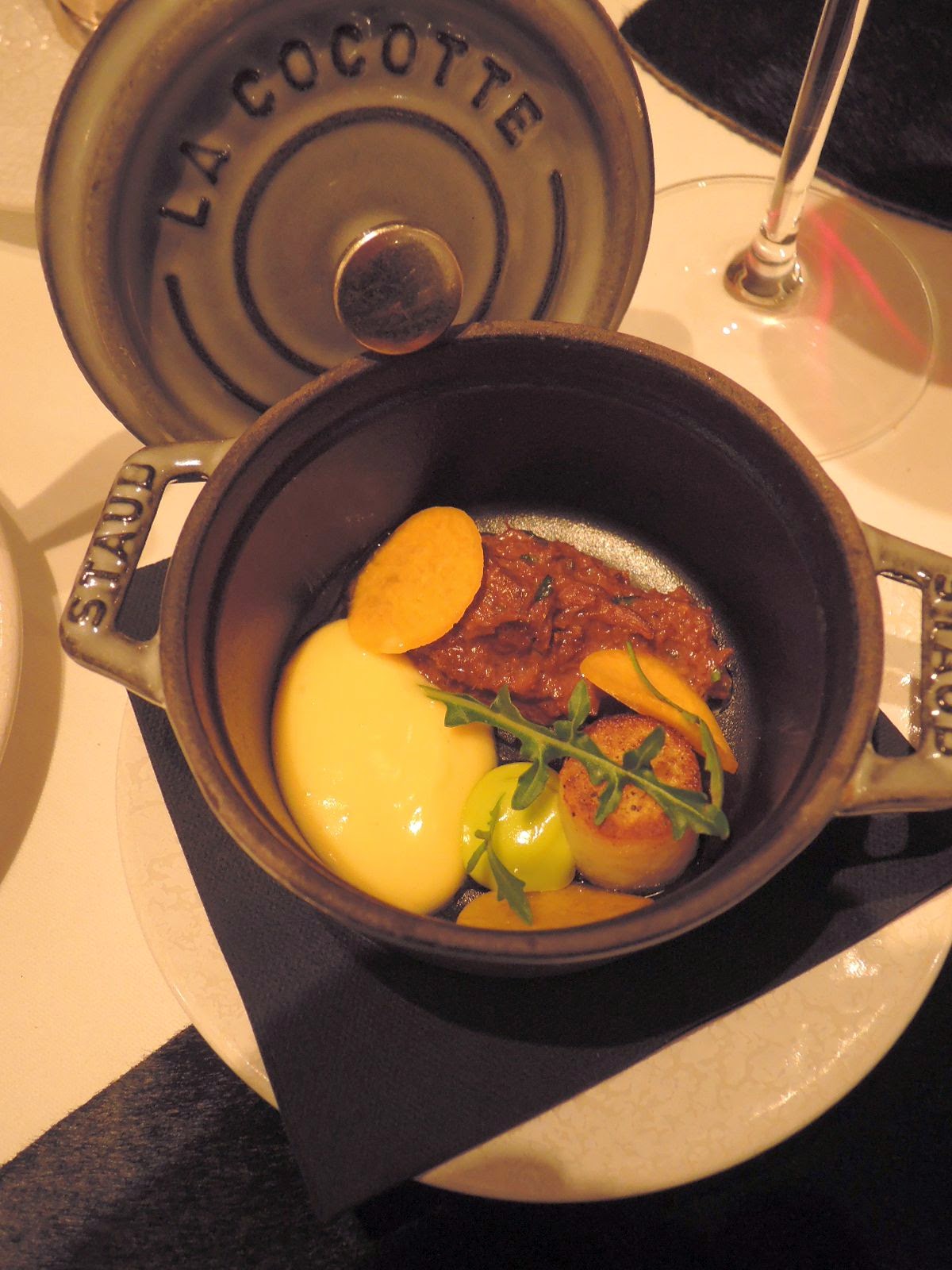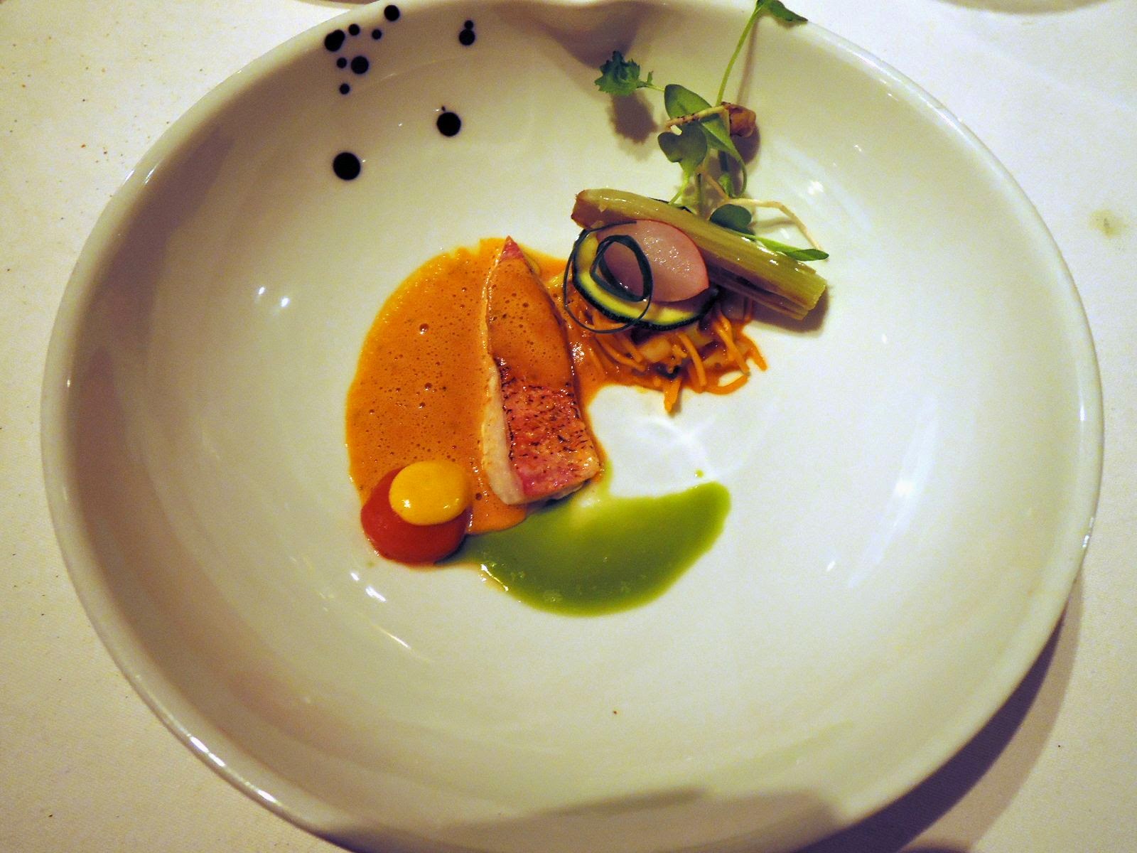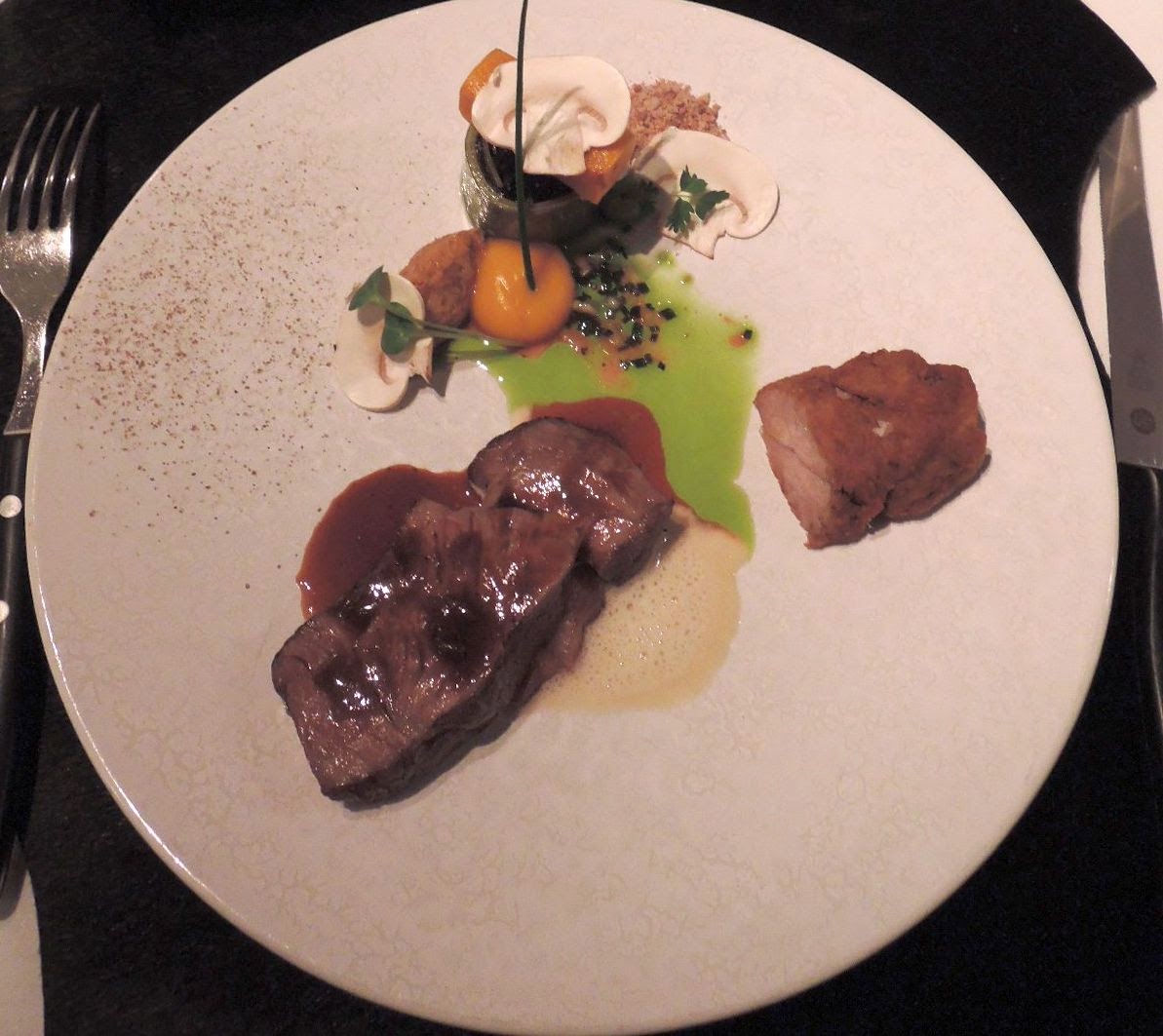 In ons arrangement was een 7-gangen diner inbegrepen. Na 5 gerechten op basis van vis en zeevruchten waren we heel blij dat we gekozen hadden om deze 8 ste gang er optioneel bij te nemen. Deze creatie rond kalfsvlees was een culinair schouwspel dat we zeker niet wilden missen. Ook dat glaasje rode wijn smaakte heerlijk na 5 verschillende witte wijnen.