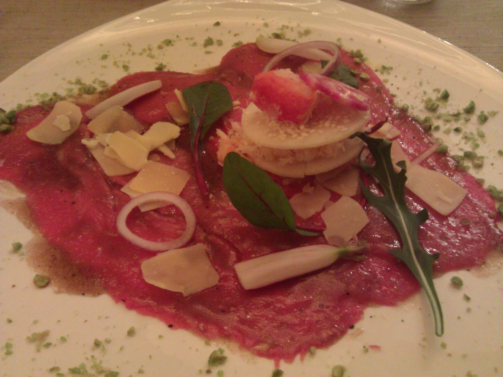 Ook het voorgerecht is enorm lekker. Super combinaties van Carpaccio met krab, appel en Parmezaanse kaas.