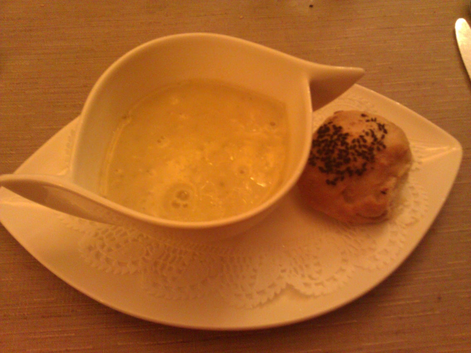 Hierna krijgen we een heerlijk tasje soep van bloemkool met kruidenkaas, mozzarella en gerookte kip. Eenvoudig maar enorm lekker.