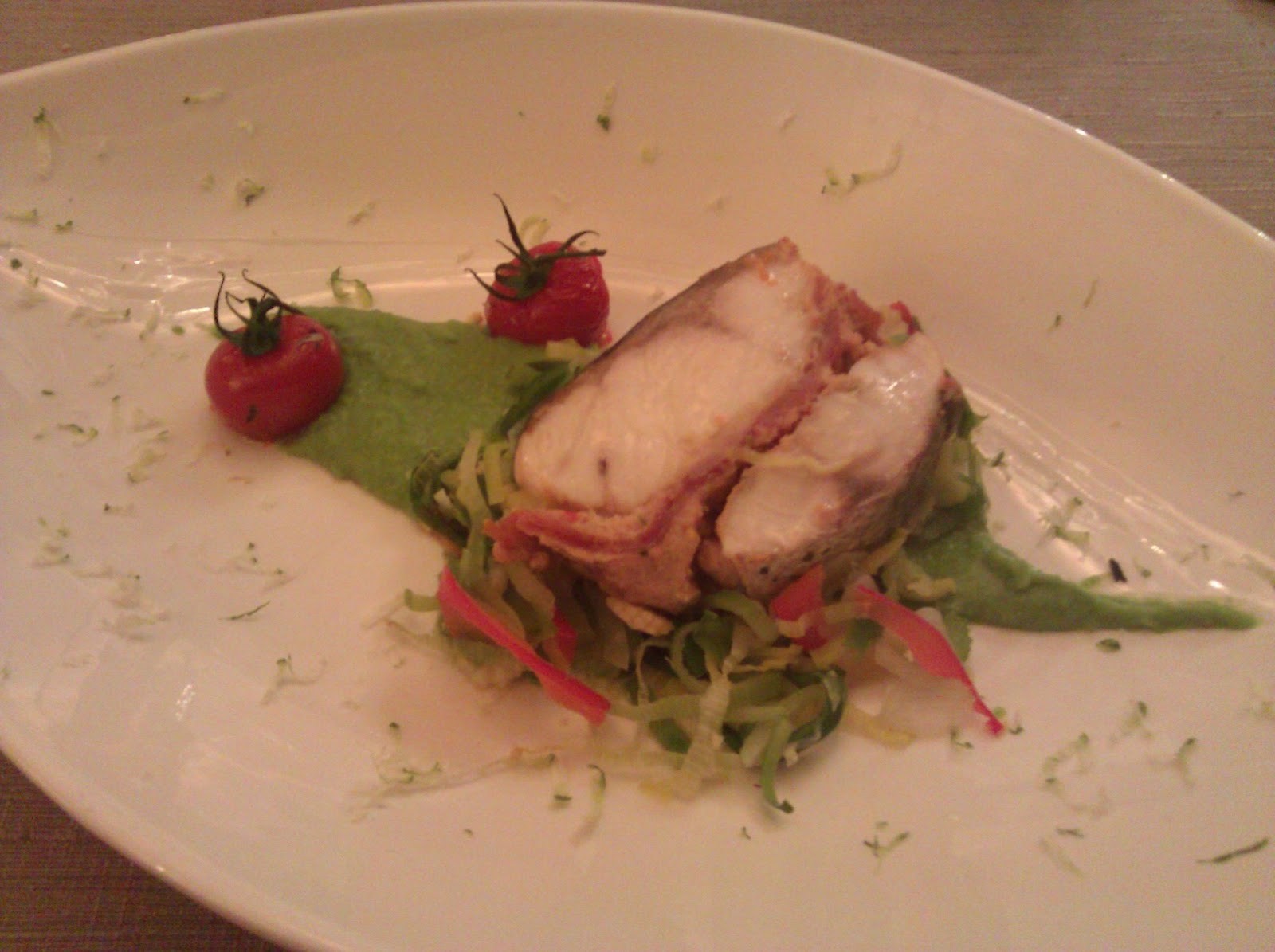Ons tussengerecht bestaat uit een lekker stukjes zeebaars met Serranoham. Dit was spijtig genoeg niet echt ons ding. Smaken verschillen natuurlijk.