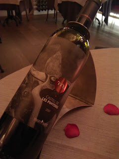 Bij dit dinner kozen we voor een flesje huiswijn “Castello de les pinyeres 2007”. Een heerlijk evenwichtige  wijn met intense smaken.