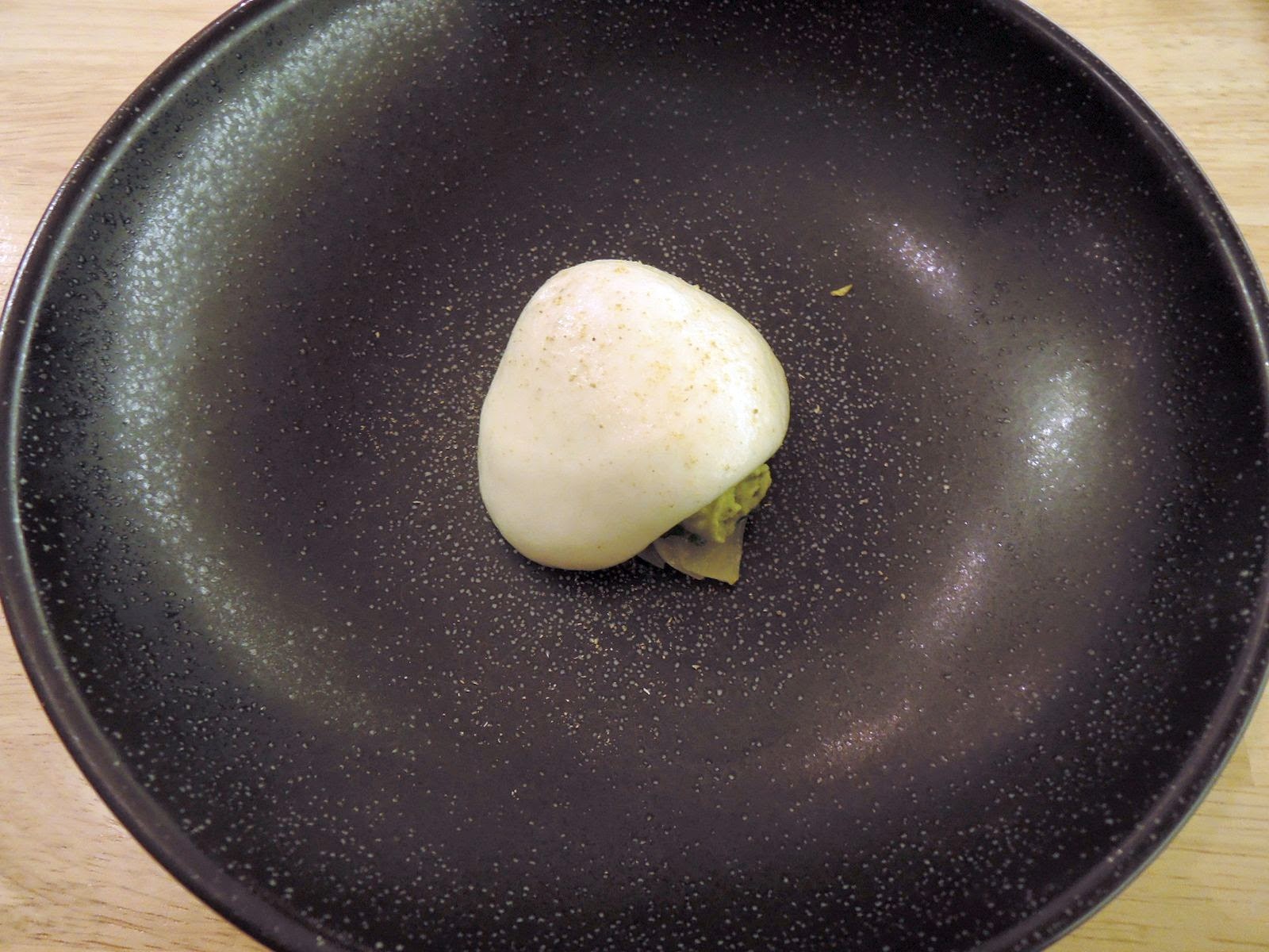 Bij deze aperitief werden 2 kleine amuses geserveerd. Een koekje van Parmezaanse kaas met mousse van kabeljauw en koolzaadjes. Het rolletjes was gepekelde rammenas met verse platte kaas en hazelnoot. 2 lekkere hapjes, die ons deden uitkijken naar een derde.