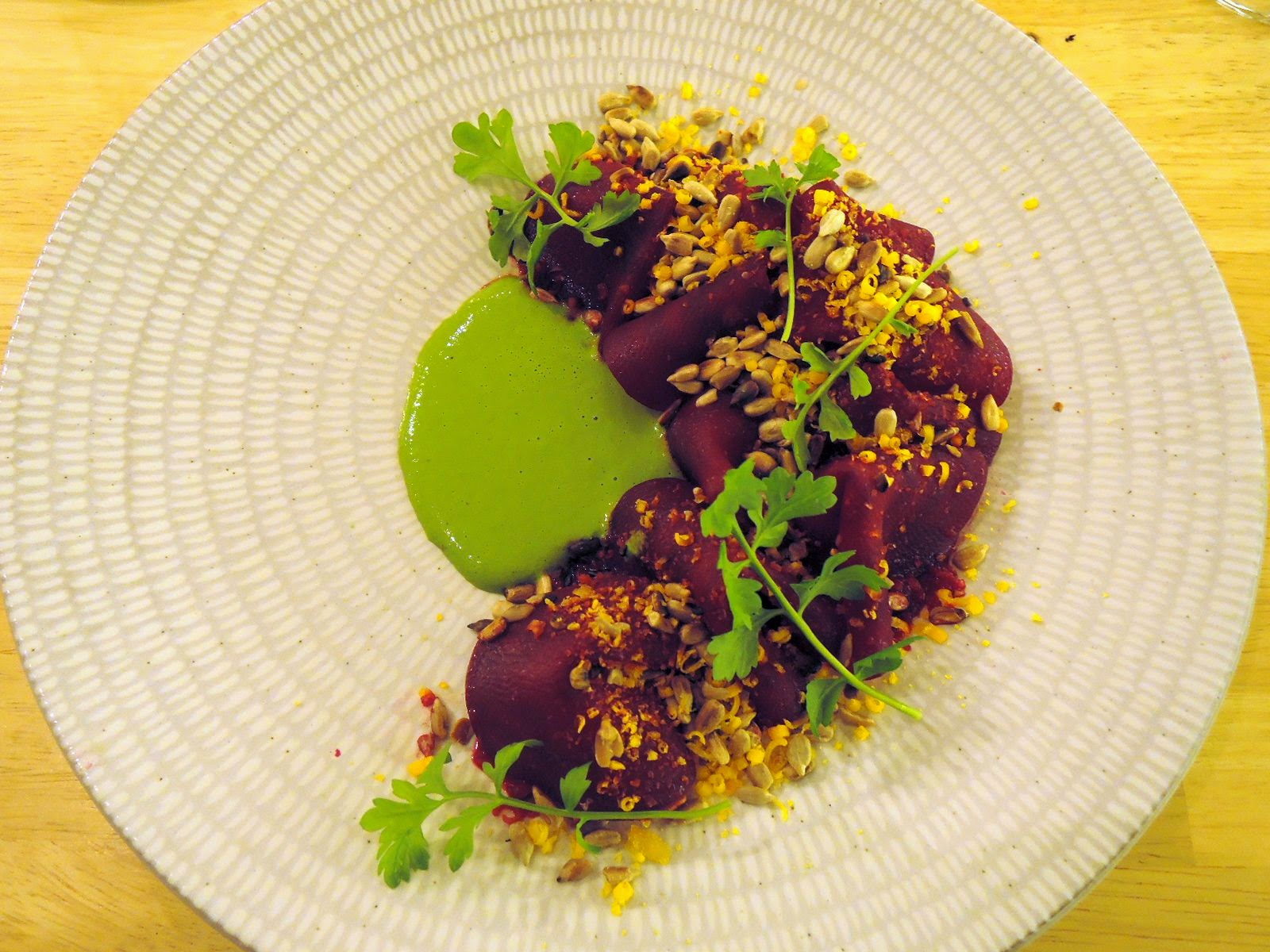 Geen derde amuse maar ons eerste voorgerecht verscheen op tafel. Een heerlijk bord zowel in kleur als in smaak. Rode biet, eidooier en kervel