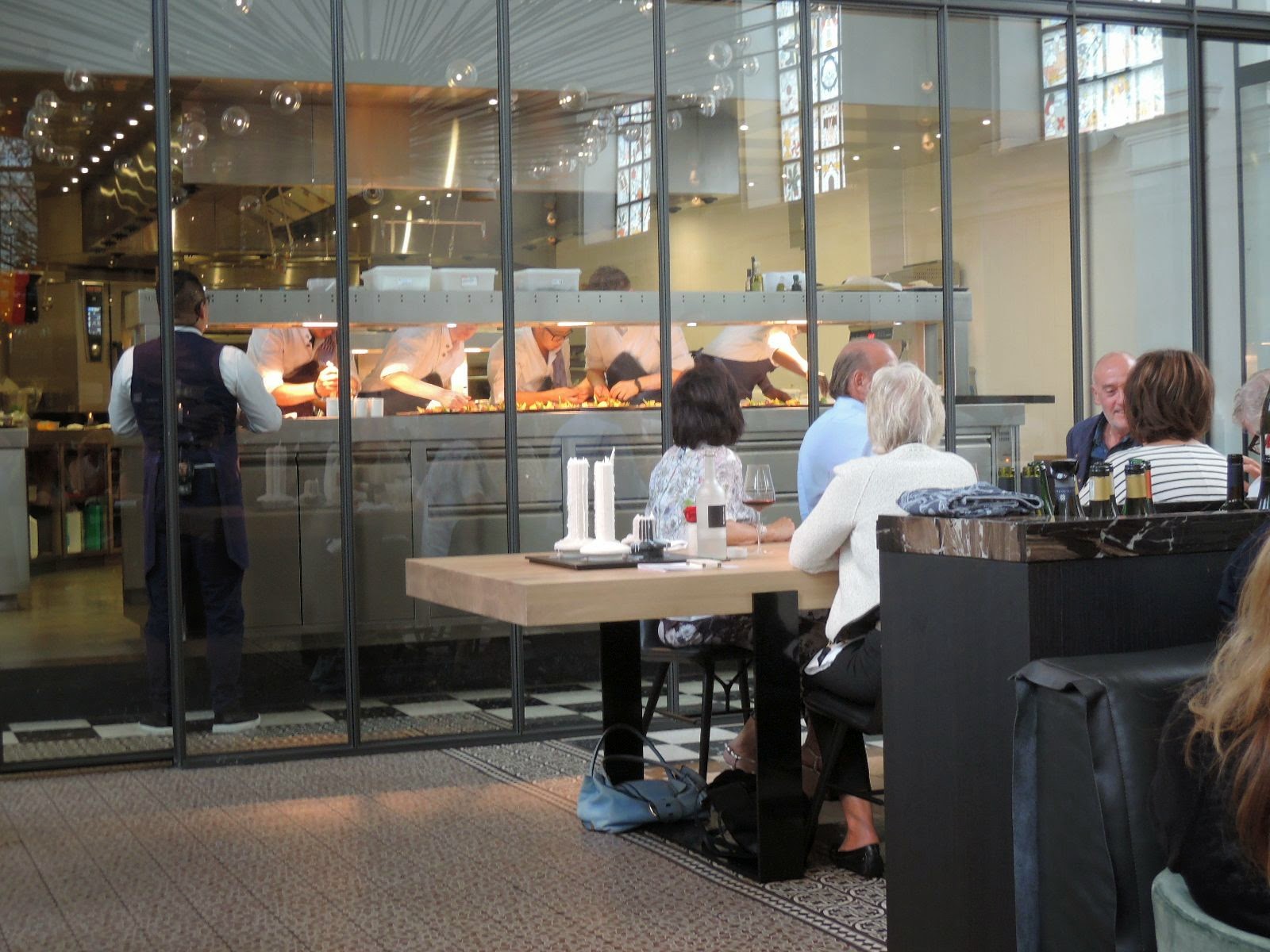 Het 19e-eeuwse militair hospitaal in het Groen Kwartier van Antwerpen werd omgebouwd tot een strak en elegant geheel. Groots, met internationale allure, maar toch gastvrij en warm. Hoewel het plafond torenhoog is zorgt de kroonluchter van 800kg uit Beiroet hier voor een intieme sfeer. Vanuit het gehele restaurant heb je zicht op de prachtige keuken waar Nick Bril achter zijn altaar staat te koken.