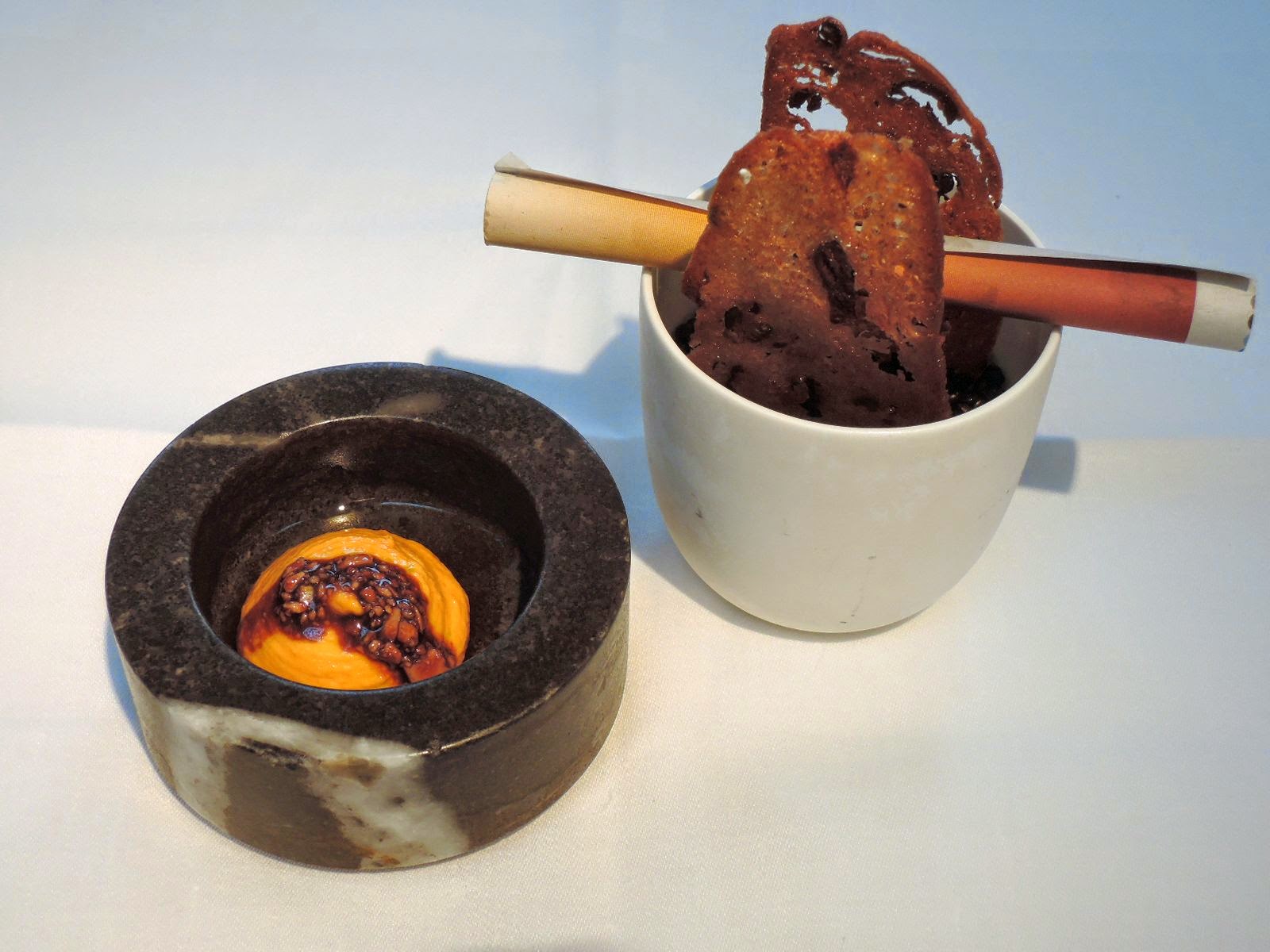 Hierbij werd een crème Romesco met rode peper, krokant brood en calçots (Prei van de BBQ) geserveerd.