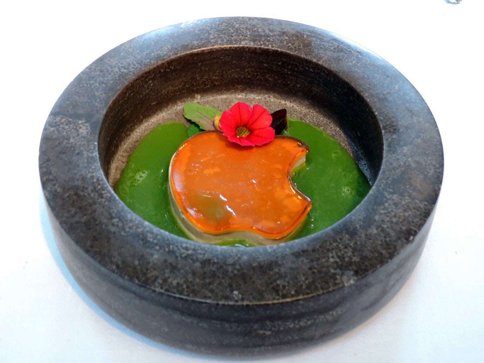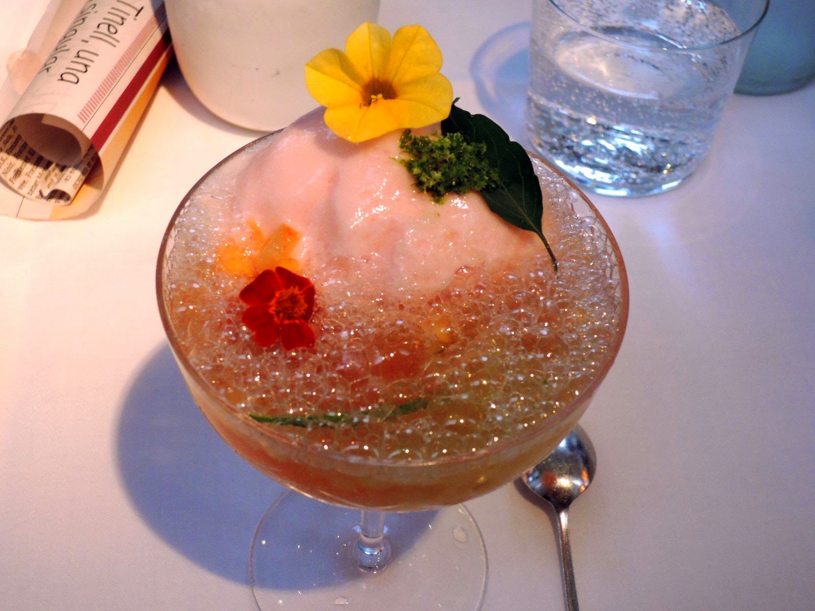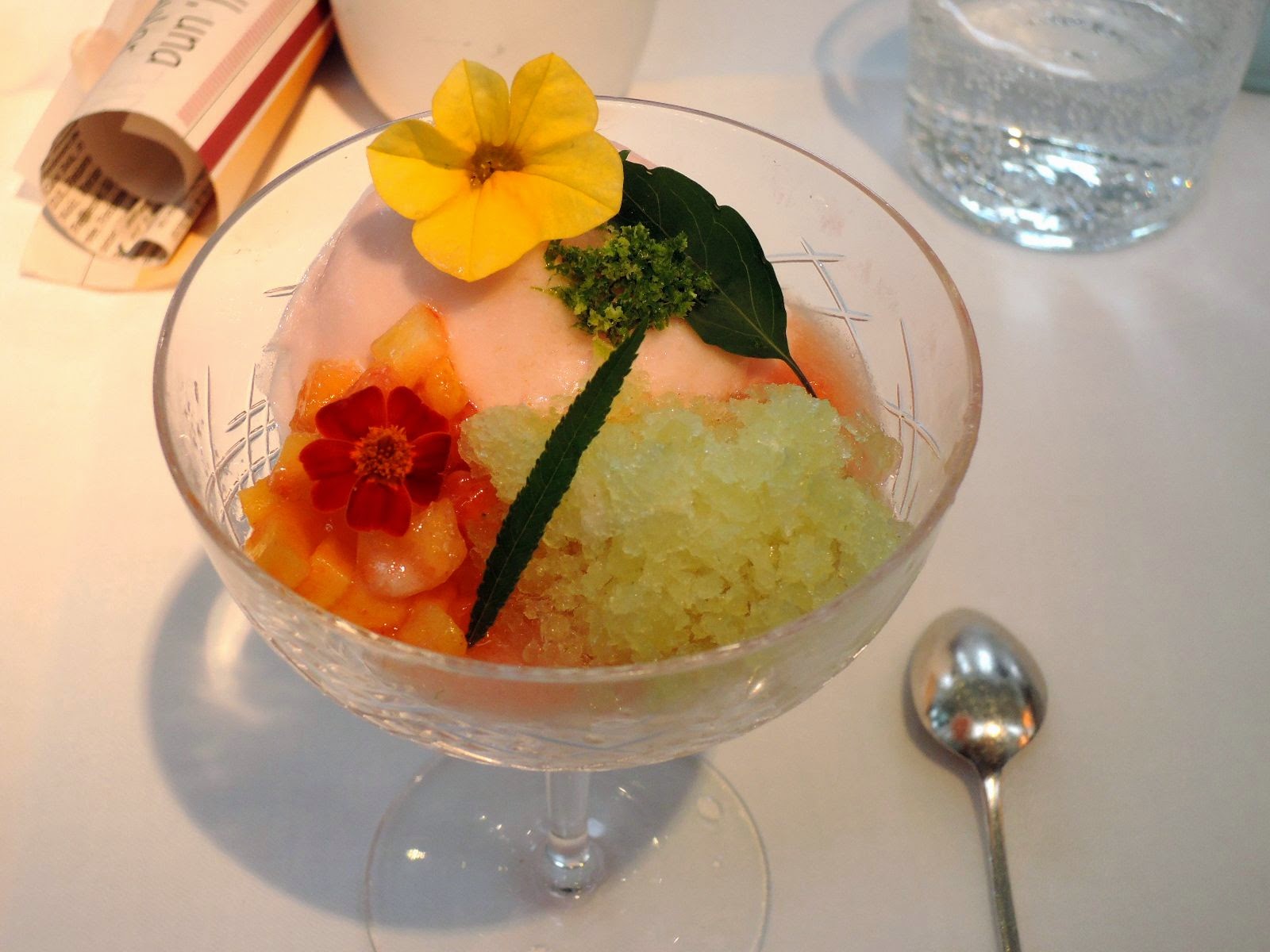 Beginnen doen we ons bezoek met een aperitief van het huis. In een champagnecoupe komt een bal van bevroren Arak, granité van passievrucht, verse kruiden & schitterende bloemetjes dit geheel werd overgoten met champagne.