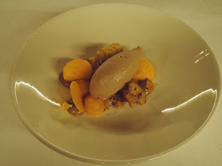 Bij een glaasje huis champagne werden er alvast 2 amuses geserveerd. Één creatie tussen wortel en bloedappelsien en op het ander bordje kwam er zeekraal en lamsoor.