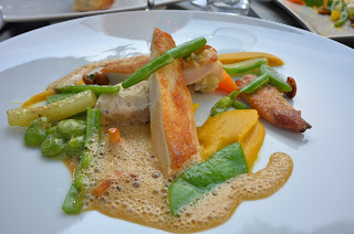 Voor de hoofdgerechten haalt Chef kok Maarten Camps alles uit de kast. Zoals hij zelf zegt: “Heerlijk om een gerecht helemaal te perfectioneren en de gasten te zien genieten“. We kregen 2 gerechten die beide enorm smaakvol waren. ik kreeg een Jong haantje, niet zomaar een stukje gevogelte. Maarten heeft hier alle smaken en textuur optimaal willen benutten, zo werd de filet gebakken, het vleugeltje geconfijt en een billetje gepocheerd, hierbij nog een gevogelte quenelle met truffel, creme van pompoen, verse tuinbonen en een schuim van cantharellen.