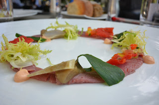 Als voorgerecht kregen we een stukje gepekeld en gerookt lamsvlees met een zomerse salade. Een prachtig bord met frisse smaken. Afwerken met een beetje olijfolie die op tafel stond en het was plots stil aan tafel.